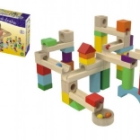 Ten drewniany tor kulkowy oferuje różnorodne ścieżki dla kulek, pobudzając kreatywność i rozwój umiejętności motorycznych.