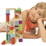 Zestaw kolorowych drewnianych bloków i torów pozwala na nieskończone możliwości budowania toru, rozwijając delikatną motorykę i kreatywność.
