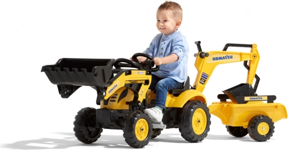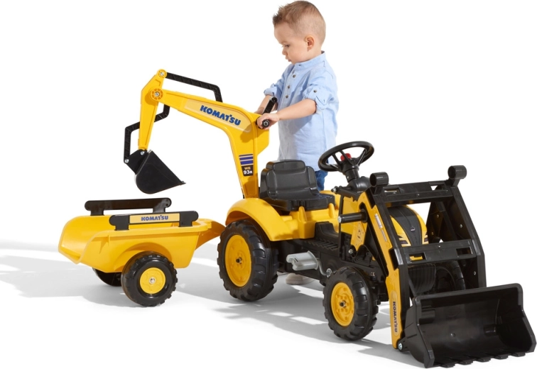 Traktor na pedały Komatsu z przednią i tylną łyżką oraz wywrotką.