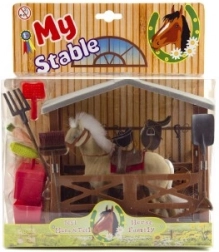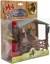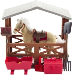 W zestawie znajduje się stajnia oraz akcesoria, takie jak wiadro, miotła, widły, łopata i kufer z przyborami – wszystko do tworzenia autentycznych scenek z farmy.