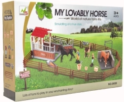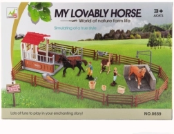 - Wybieg z ogrodzeniem, 2 figurki koni, opiekunowie, akcesoria do pielęgnacji (siodła, karmienie, akcesoria do czyszczenia i prysznica)