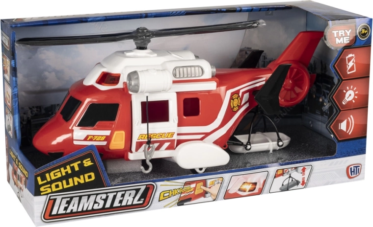 Strażacki helikopter Teamsterz ze świetlnymi i dźwiękowymi efektami. Helikopter ma nosze, ręcznie obsługiwaną wyciągarkę oraz otwierane boczne drzwi. Odpowiedni dla dzieci od 3 lat. Produkt wymaga 3× baterii AAA, które są dołączone do opakowania.