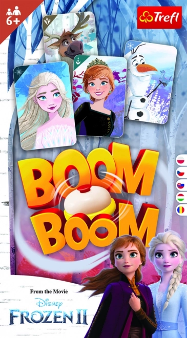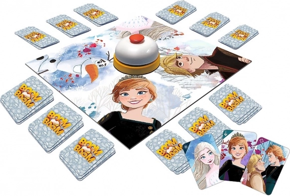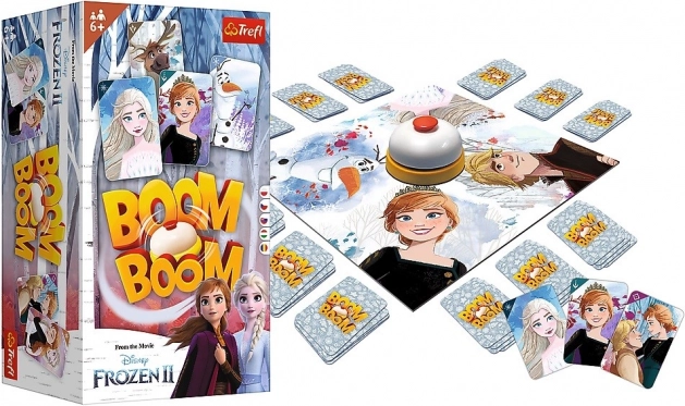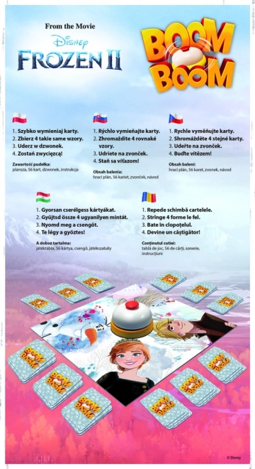 Przeżyj z grą karcianą Boom Boom w świecie Krainy Lodu 2 szybką i pełną zabawy akcję! Wymieniaj karty, zbieraj zestawy i uderz w dzwonek, aby wygrać. Ta gra jest idealna dla całej rodziny i dzieci od 6 lat.