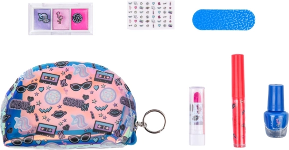 Zestaw zawiera 3× cienie do powiek do delikatnego i bardziej wyrazistego makijażu, lakier do paznokci uzupełniony naklejkami do oryginalnego zdobienia, błyszczyk do ust i pomadkę do wykończenia wyglądu oraz praktyczny pilnik. Dzięki kompaktowym wymiarom jest idealny na wycieczki, do babci lub do szkolnego plecaka.