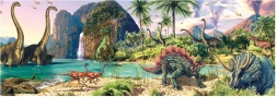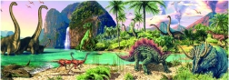 Te puzzle składają się ze 150 elementów tworzących fascynującą scenę pełną dinozaurów w tropikalnym otoczeniu, gdzie dzieci poznają dawny świat.