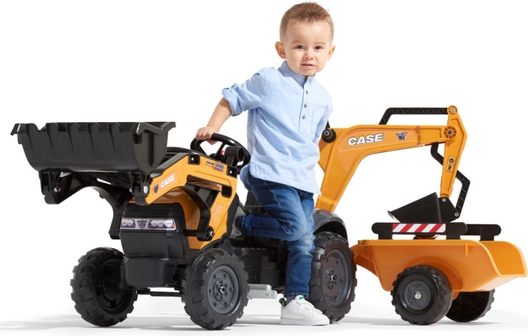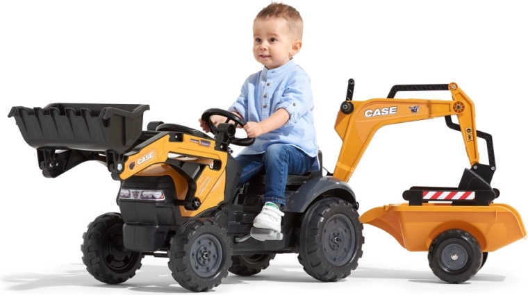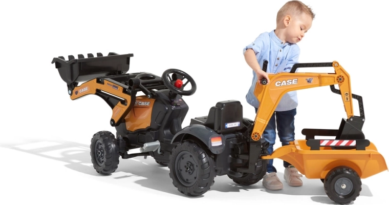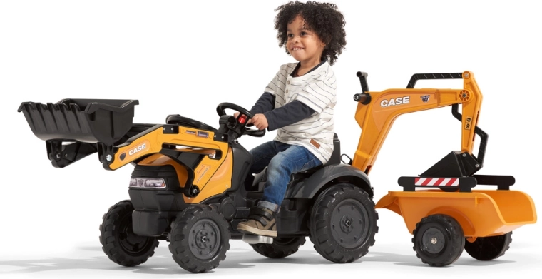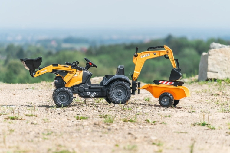 Ten realistyczny traktor na pedały CASE to doskonały towarzysz do zabawy na zewnątrz, w ogrodzie i na piaskownicy. Dzieci zachwyci ruchoma przednia łyżka do ładowania piasku lub ziemi oraz tylna koparka sterowana z obrotowego siedzenia. Odczepiana przyczepa łatwo przewiezie wszystkie „skarby” z budowy. Dzięki stabilnej konstrukcji i wytrzymałemu plastykowi jest gotowy na codzienne przygody.