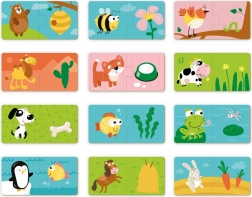 Odkryj pierwsze układanki dla najmłodszych – zestaw DODO puzzle „Co jedzą zwierzątka?” oferuje 12 prostych, dwuelementowych układanek, które rozwijają logikę, małą motorykę i poznawanie świata. Duże i solidne elementy o grubości ok. 3 mm łatwo się chwyta i układa, więc są idealne dla dzieci rozpoczynających przygodę z puzzlami.