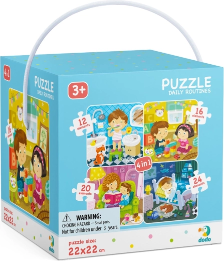 Dziecięce puzzle marki DODO z obrazkami codziennych czynności. Wymiary puzzli po ułożeniu: 22×22 cm. Wiek: 3+