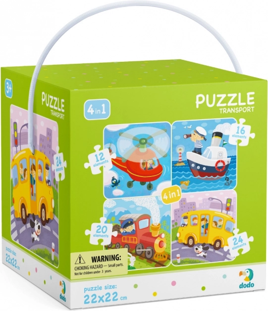 Odkryj zabawne, progresywne puzzle z motywem środków transportu od marki DODO. Zestaw zawiera 4 układanki o rosnącym poziomie trudności: 12, 16, 20 i 24 elementy, idealne do rozwijania dziecięcej cierpliwości, logiki i motoryki małej. Każde ułożone puzzle ma w przybliżeniu 22 × 22 cm.