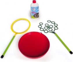 W opakowaniu znajdziesz dwie obręcze – jedną do olbrzymich baniek, a drugą do wielu drobnych banieczek, dalej czerwoną miskę do wygodnego moczenia oraz płyn 0,5 l. Idealny na rodzinne popołudnia, przyjęcia i gry na świeżym powietrzu.