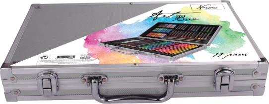 Zestaw zawiera 79 elementów, w tym farby akwarelowe, kredki, pędzle, gumkę i temperówkę do wszelkich potrzeb artystycznych.