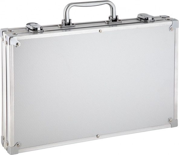 Ta metalowa walizka jest wyposażona w solidny uchwyt i bezpieczne zatrzaski, co umożliwia łatwe przenoszenie i bezpieczną organizację wszystkich przyborów.