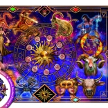 Kolorowa kompozycja przedstawia wszystkie znaki zodiaku w mistycznej kosmicznej palecie – idealna dla fanów astrologii.
