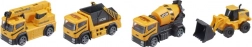 Zestaw zawiera cztery różne pojazdy budowlane: betoniarkę, ciężarówkę, koparkę i auto z dźwigiem, każde z realistycznymi detalami i funkcjami dla rzeczywistego wrażenia podczas zabawy.