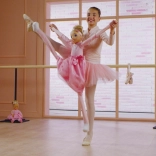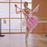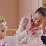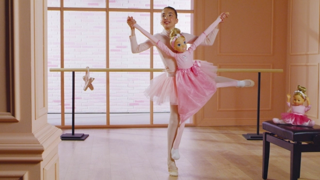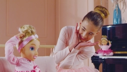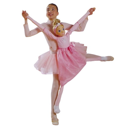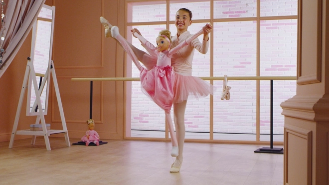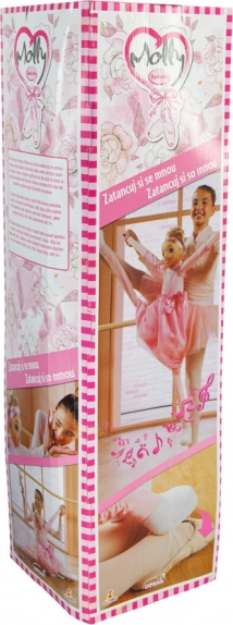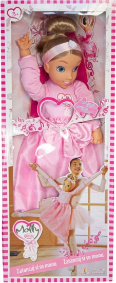 Zabawka wspiera dzieci w treningu baletu dzięki możliwości interakcji z figurką w studiu tanecznym. Dziewczynka na obrazku i baletka Molly demonstrują prawdziwe baletowe pozycje.