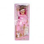 Baletka Molly ma urocą różową sukienkę z dopasowaną opaską i włosami stylizowanymi w kok. Jej twarz jest delikatnie dopracowana, a duże oczy podkreślają jej elegancki wygląd.
