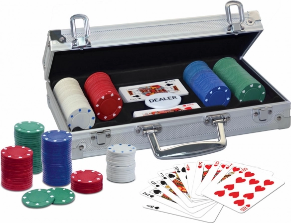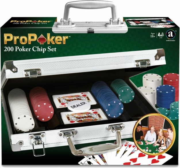 Ciesz się autentycznym doświadczeniem gry w pokera z kompletnym zestawem ProPoker 200. Zawiera 200 żetonów, 2 talie kart, żeton dealera i wytrzymałą aluminiową walizkę do łatwego przenoszenia. Idealny do Texas Hold'em oraz domowych turniejów dla 2–6 graczy.