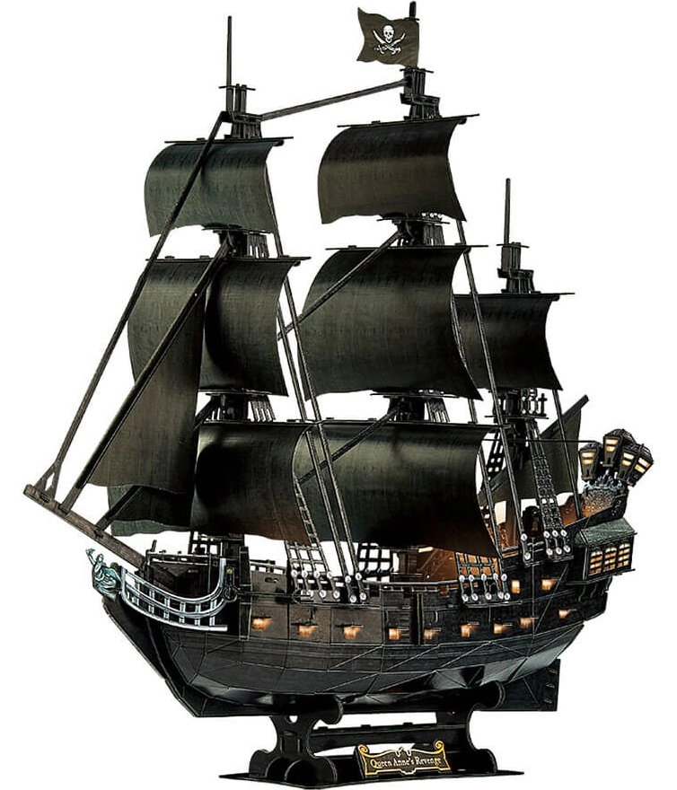 Zachwycający model 3D żaglowca z oświetleniem LED! Żaglowiec Queen Anne's Revenge był okrętem budzącego grozę pirata Czarnobrodego. Mimo krótkiego, rocznego okresu użytkowania pomógł umocnić jego status jako najgroźniejszego pirata. Puzzle 3D marki CubicFun to zestaw konstrukcyjny z oświetleniem LED, wykonany ze specjalnego materiału – około 3 mm grubej pianki pokrytej laminowanym, zadrukowanym papierem.