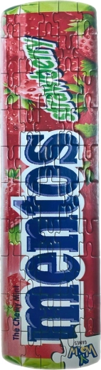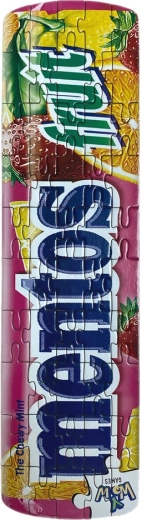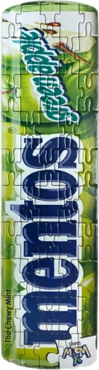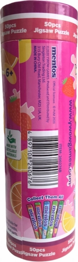 Pudełko w designie ulubionych cukierków MENTOS. Puzzle mają 50 elementów, a pudełko oraz same puzzle są wykonane z materiałów nadających się do recyklingu. Produkt odpowiedni dla dzieci od 6 lat.
