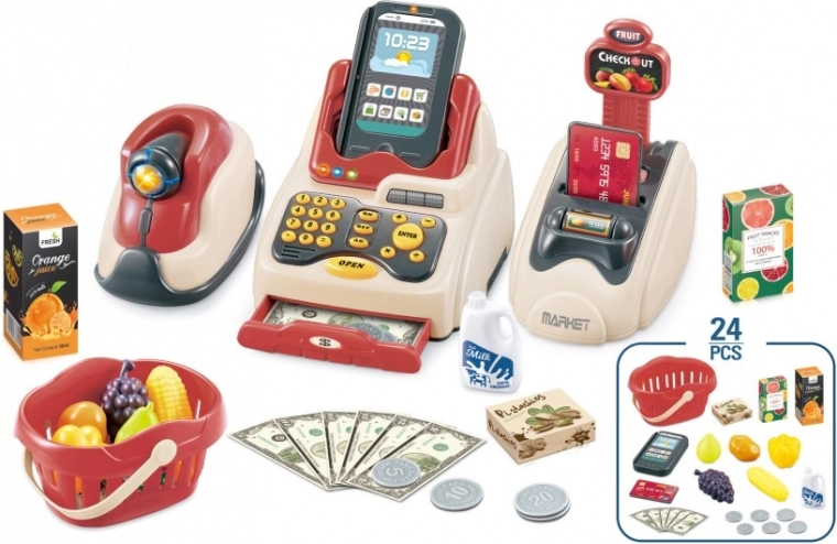 W zestawie jest wszystko, czego mały sprzedawca potrzebuje: kasa z przyciskami, czytnik kart, terminal płatniczy do płatności bezgotówkowych, koszyk na zakupy, pieniądze-zabawki oraz bogaty wybór towarów do „kupowania”. Idealny do zabawy w odgrywanie ról, rozwijania komunikacji i współpracy z rówieśnikami.