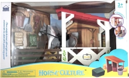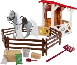 Stajnia, zagroda, figurka konika, karma i narzędzia do pielęgnacji