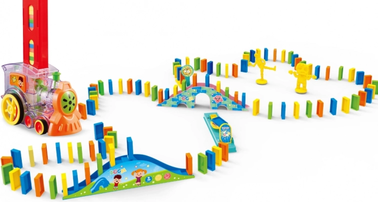 Zabawna lokomotywa z domino dla dzieci od 3 lat zapewnia godziny twórczej zabawy. Poruszająca się lokomotywa automatycznie ustawia kostki domina, a dzieci obserwują ich efektowny upadek. Wspiera małą motorykę, kreatywność, koncentrację i myślenie logiczne. Wymaga 2× baterii AA (brak w zestawie).