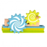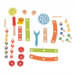 Kolorowe koła zębate i elementy konstrukcyjne przybliżają zasady mechaniki w przystępny, zabawowy sposób i wspierają kreatywność.