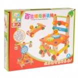 W zestawie drewniany śrubokręt, klucz, śruby i nakrętki – dzieci uczą się prawidłowo łączyć elementy i rozwijają małą motorykę.