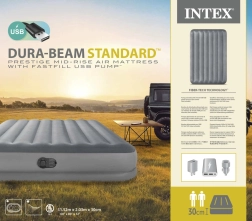 Nadmuchiwane łóżko o wymiarach 152 cm x 203 cm x 30 cm. Maksymalne obciążenie 272 kg. Czas nadmuchiwania: 5,5 minuty. Łatwe pompowanie, spuszczanie powietrza i przechowywanie. Wbudowana elektryczna pompka.