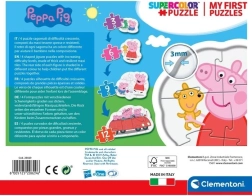 Zabawka jest przeznaczona dla dzieci od 2 lat, aby mogły bezpiecznie poznawać świat puzzli z pomocą ulubionych bohaterów z rodzinki Peppy. To opakowanie zawiera cztery różne puzzle o rosnącym poziomie trudności, od 3 do 12 elementów.