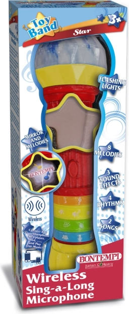 Zabawny bezprzewodowy mikrofon zamieni każdy występ w show. Oferuje efekty świetlne, podświetlane lusterko, 2 wgrane piosenki, 4 rytmy, 8 melodii oraz 3 efekty dźwiękowe. Dla wygodnej obsługi nie zabrakło automatycznego wyłączania.