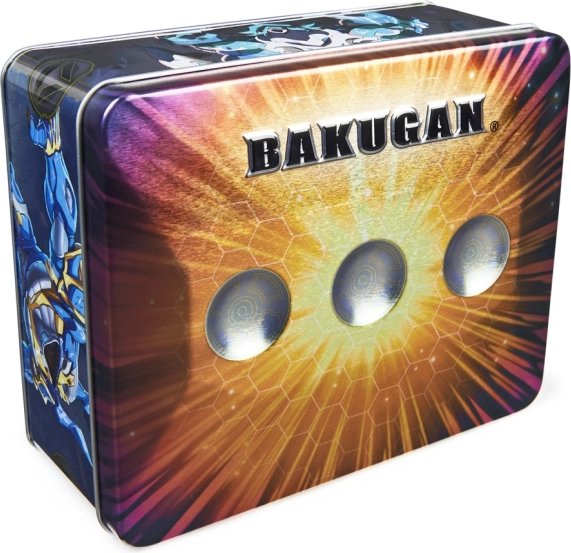 Stylowe metalowe pudełko w nowym designie, które pomieści do 6 Bakuganów, 2 talie po 40 kart oraz 12 Baku-Żetonów. Zestaw zawiera: 1 metalowe pudełko z pokrywką, 1 ekskluzywnego Bakugana, 1 tajemniczego Bakugana, 4 Baku-Żetony, 2 karty postaci, 2 karty Gate. Odpowiednie od 6 lat.