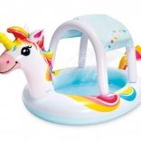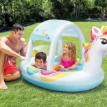 Uroczy dmuchany basen w kształcie jednorożca zapewni dzieciom godziny letniej zabawy. Dzięki zintegrowanemu rozpylaczowi wody oraz kolorowej daszkowej osłonie oferuje orzeźwienie i częściowy cień. Wykonany z wysokiej jakości winylu, ma pojemność do 130 l, wymiary 2,54 × 1,32 × 1,09 m i jest odpowiedni dla dzieci od 2 lat. W zestawie znajduje się również łatka naprawcza.