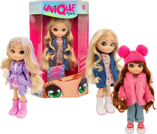 Odkryj urok lalki Unique Eyes – stylowa lalka o wysokości 25 cm z magicznymi oczami, które podążają za Twoim wzrokiem, długimi, miękkimi włosami oraz modnym strojem i butami. Dostępna w 3 różnych wariantach, idealna dla dzieci od 3 lat.