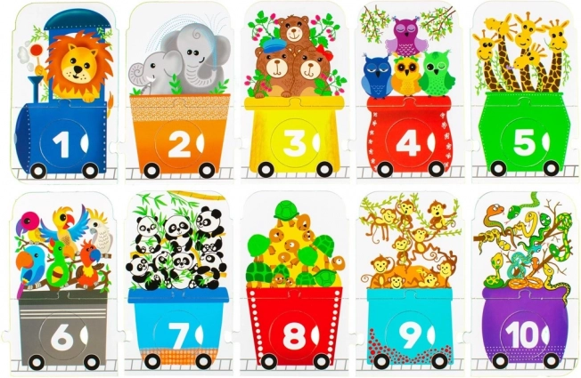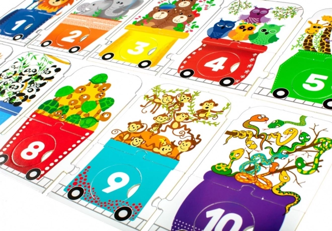 Dziecięce puzzle w kształcie pociągu stanowią zabawne wyzwanie dla małych odkrywców. Składa się z lokomotywy i dziewięciu wagonów, z których każdy ma inną ilość zwierzątek: