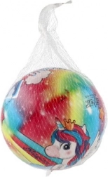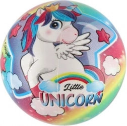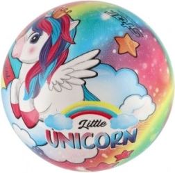 Piłka ozdobiona jest motywem jednorożca z tęczą, gwiazdami i chmurami, co czyni ją wizualnie atrakcyjną dla dzieci.