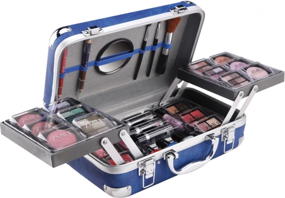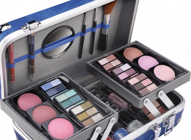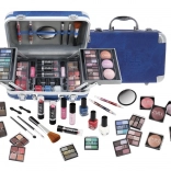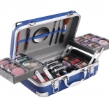 Kosmetyczna walizeczka z aluminiowymi narożnikami Travel Blue z wbudowanym lusterkiem – łącznie 84 sztuki akcesoriów.