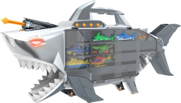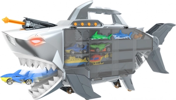 Wyrusz na przygodę z rekinim transporterem, który pomieści aż 24 autka i oferuje światła, dźwięki oraz otwierane szczęki. Dzięki rączce i kółkom jest łatwy do przenoszenia, nie brakuje też rampy szybkiej jazdy i wyrzutni rakiet oraz bogatych akcesoriów do natychmiastowej zabawy.