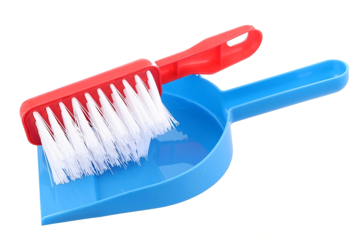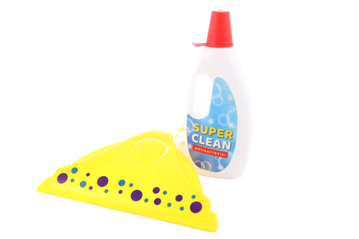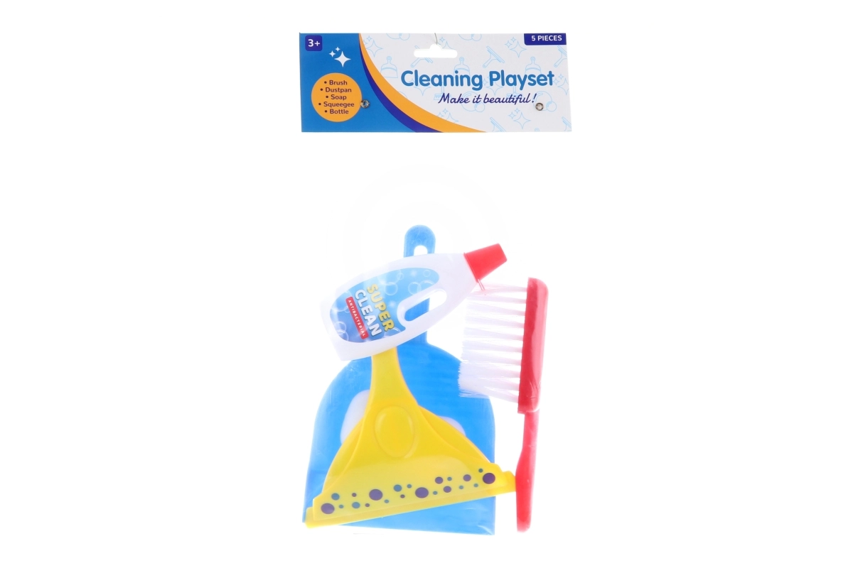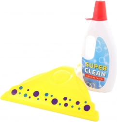Zestaw do sprzątania dla małych gospodyń zawiera – szufelkę, zmiotkę, ściągaczkę do okien, gąbki i środek myjący.