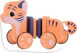 Ta wesoła i wysokiej jakości drewniana zabawka do ciągnięcia jest wyposażona w kółka zamiast nóg, co umożliwia płynny ruch podczas ciągnięcia za sznurek. W trakcie jazdy jego ciało faluje dzięki kolorowym prostokątom na grzbiecie, co przyciąga uwagę dziecka i wspiera naukę rozpoznawania barw. Zabawka wykonana jest z drewna z certyfikatem FSC, co gwarantuje pochodzenie z lasów zarządzanych w sposób zrównoważony.