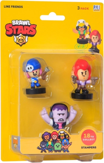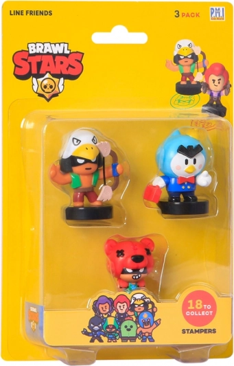 Zestaw zawiera trzy kolekcjonerskie figurki z motywem Brawl Stars w żywych kolorach, zapakowane w żółtym blisterze.