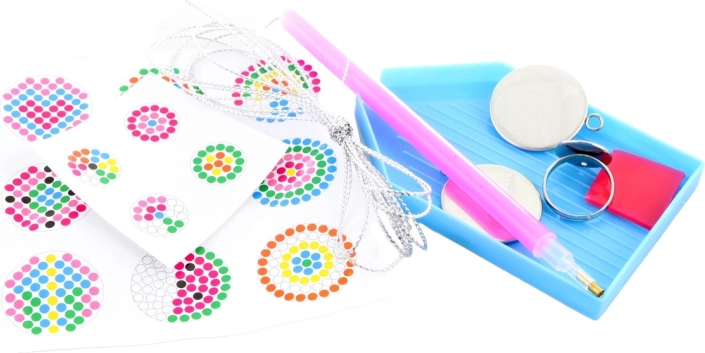 Zestaw zawiera 8 kolorów kryształków, bazę do zawieszki i pierścionka, sznureczek, 9 szablonów do zawieszek, 4 szablony do pierścionków, podkładkę oraz pisak aplikacyjny – wystarczy otworzyć i tworzyć.
