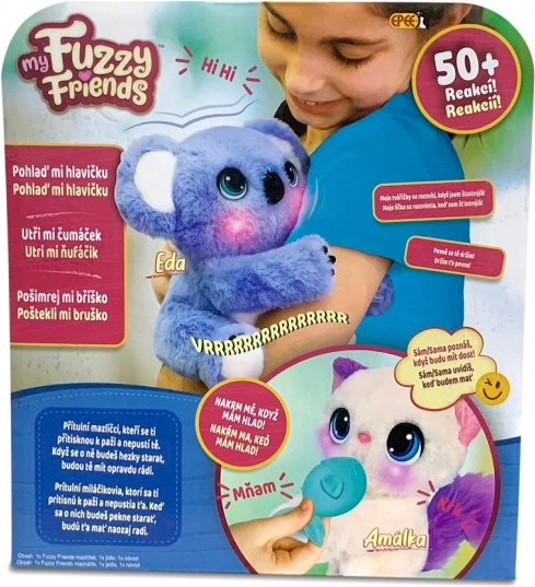 Odkryj magię interaktywnej pluszowej koali Edy z linii My Fuzzy Friends. Ten przytulaśny przyjaciel reaguje na dotyk i interakcję na ponad 50 różnych sposobów, w tym dźwiękami i ruchami. Eda ma specjalne stawy, które pozwalają jej objąć dziecięce ramię i przytulić się. Koalę można głaskać, łaskotać, karmić, wytrzeć jej nosek, a nawet pomóc jej zasnąć.
