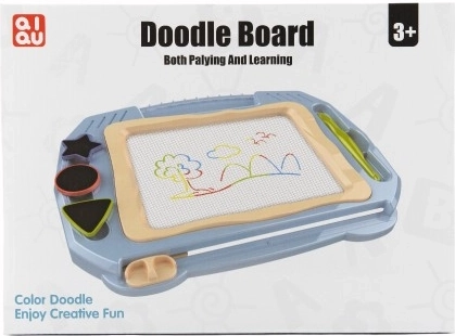 Odkryj zabawny sposób na wspieranie dziecięcej kreatywności – magnetyczna tablica do rysowania w niebieskim kolorze z długopisem na sznurku i trzema magnetycznymi stempelkami (kółko, gwiazdka, trójkąt). Jednym ruchem suwaka łatwo zmażesz obrazek i możesz tworzyć od nowa, bez końca.