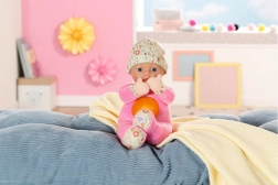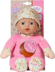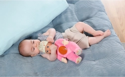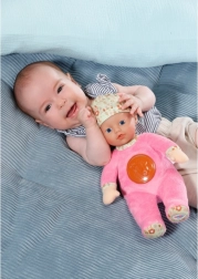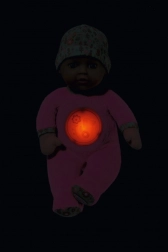 Ta mięciutka lalka o wielkości 30 cm to idealna towarzyszka do kołyski i łóżeczka. Dzięki zintegrowanemu nocnemu światłu i delikatnej kołysance uspokaja maluszka i pomaga mu łatwiej zasnąć. Miękkie tekstylne ciałko, pluszowy pajacyk i winylowa główka z czapeczką w gwiazdki zachęcają do przytulania i delikatnej zabawy.