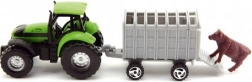 Żółty traktor z przyczepą ma realistyczne detale i jest wykonany z plastiku dla długotrwałej trwałości.