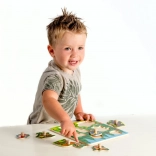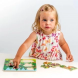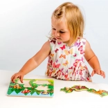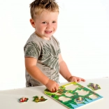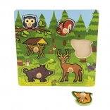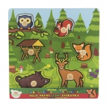 Leśne motywy takie jak sowa, wiewiórka, dzik czy jeleń w przystępny, zabawny sposób zachęcają do odkrywania. Drewniana podkładka z ramkami utrzymuje każdy element na swoim miejscu i ułatwia prawidłowe dopasowanie według kształtu i obrazka.