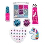Rozbudź dziecięcą wyobraźnię z dziecięcym zestawem do makijażu LUKKY w motywie jednorożca. W opakowaniu znajdziesz błyszczące żele, błyszczyk do ust z aromatem, zdejmowany lakier do paznokci, połyskujące cienie do powiek z aplikatorem, naklejki-kryształki oraz pilniczek do paznokci – idealne do kreatywnej i radosnej zabawy od 3 lat.