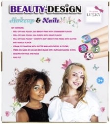 Zestaw LUKKY Beauty Design Make‑up & Paznokcie zawiera wszystko, czego dzieci potrzebują do pierwszego kreatywnego makijażu i zdobienia paznokci. Peel‑off lakiery łatwo się nakładają i zdejmują bez zmywacza, błyszczące kremowe cienie rozświetlą każdy look, a naklejki z „kamyczkami” dodadzą figlarnego blasku.