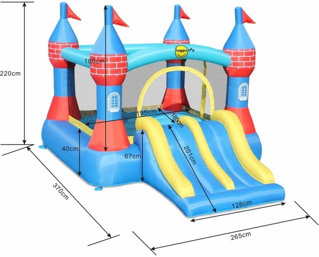 Dmuchany zamek Happy Hop z podwójną zjeżdżalnią to świetny wybór do zabawy na świeżym powietrzu dla dzieci w wieku 3–10 lat. Oferuje dużą powierzchnię do skakania i dwie szerokie zjeżdżalnie, które zwiększają płynność zabawy i frajdę dla kilkorga dzieci jednocześnie. Wysokiej jakości materiały i stabilne kotwiczenie zapewniają bezpieczeństwo i długą żywotność.